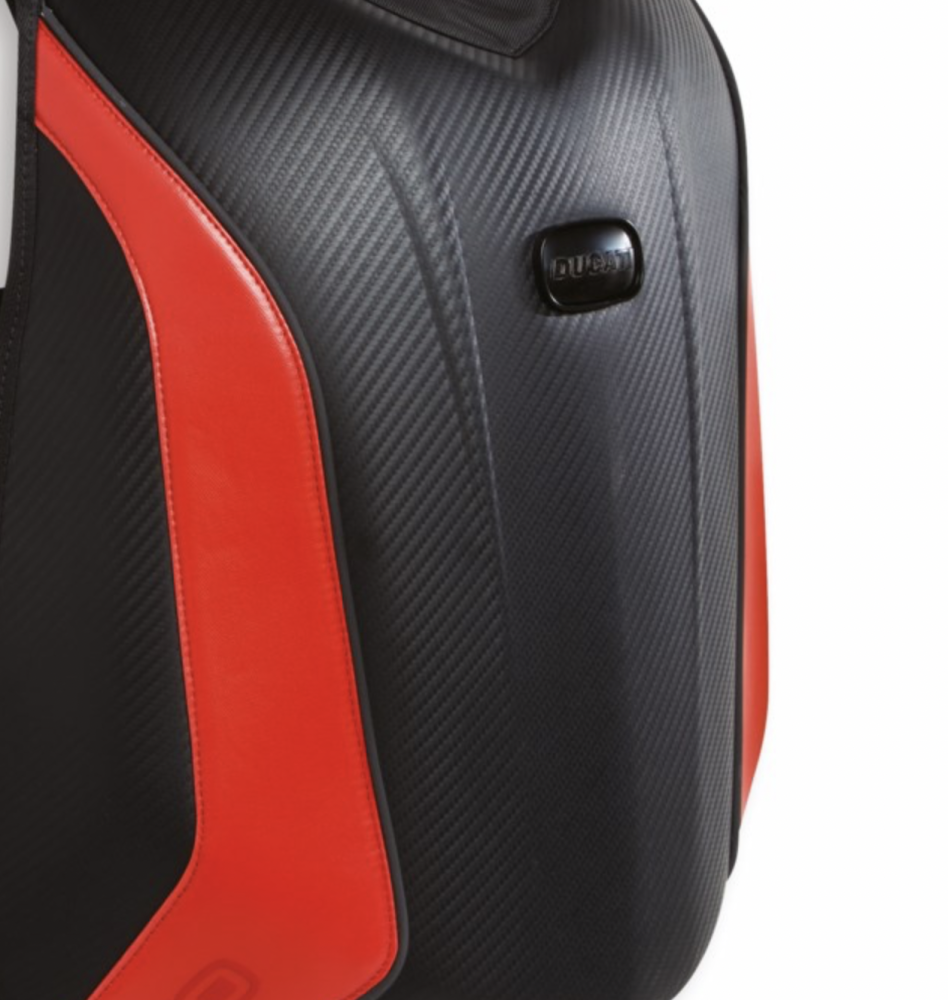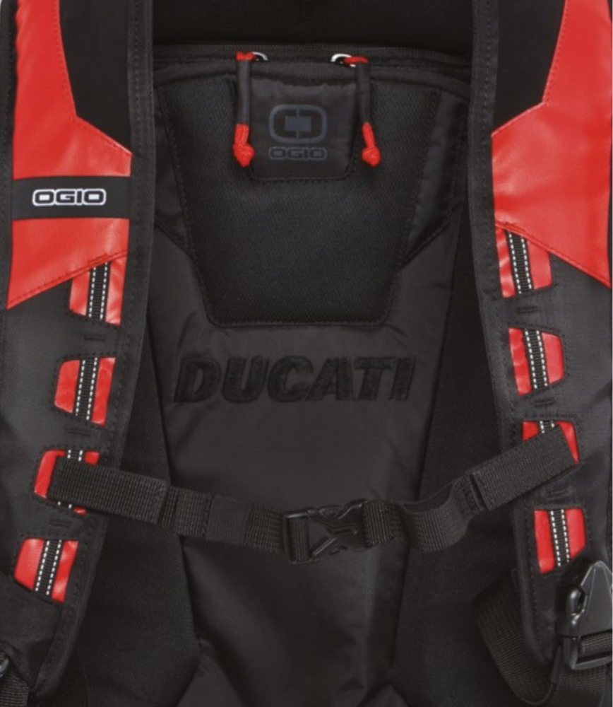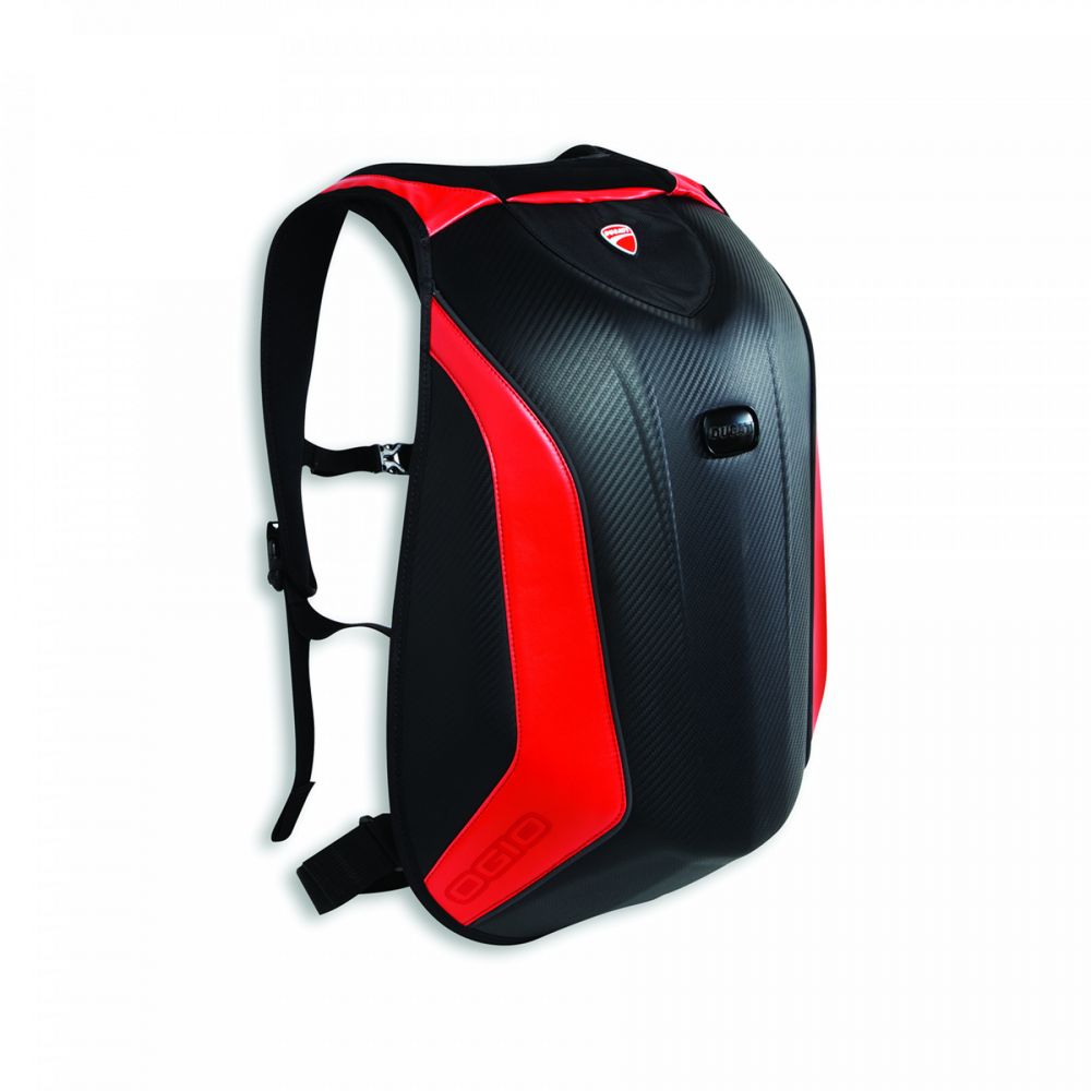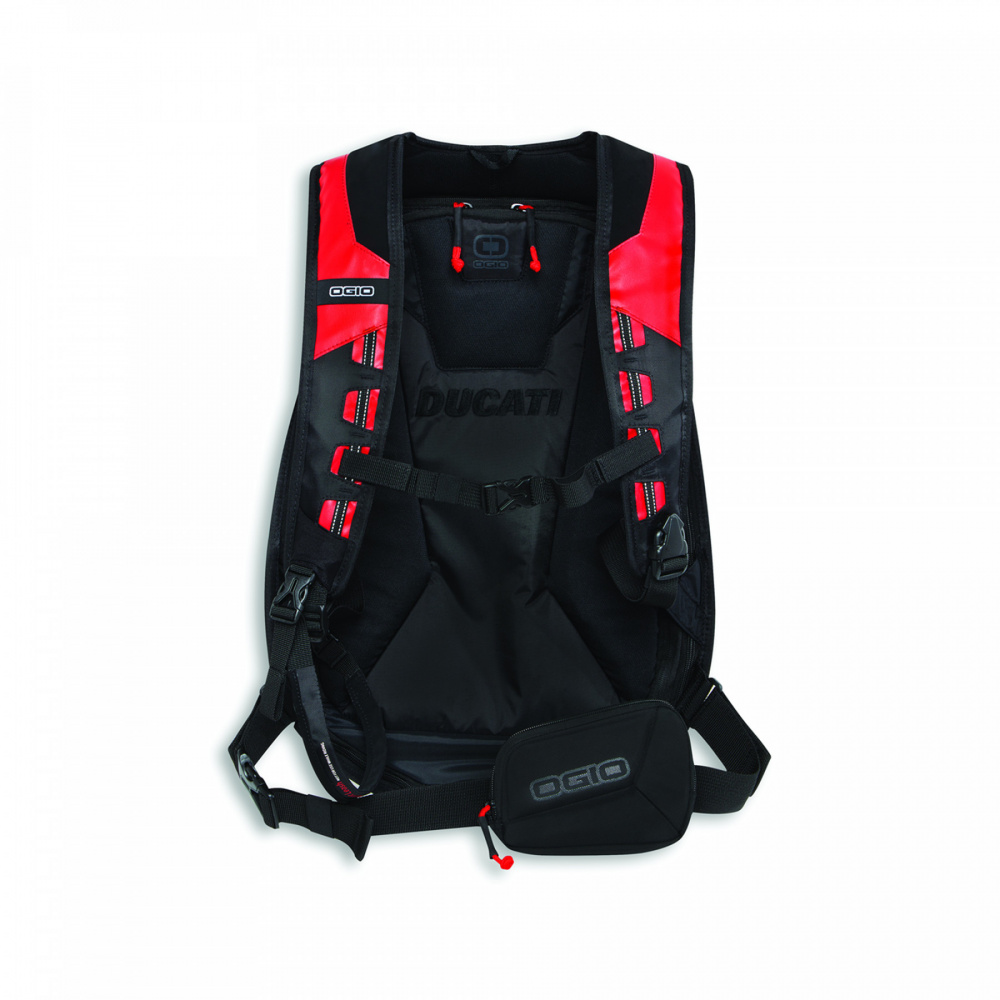 The Redline B1 backpack, designed by Ogio and customized for Ducati, is a preformed technical knapsackengineered specifically for motorcycle use. Its semi-rigid outer shell conforms to the rider’s body and retains its shape in the wind, ensuring aerodynamic performance and comfort on the road.