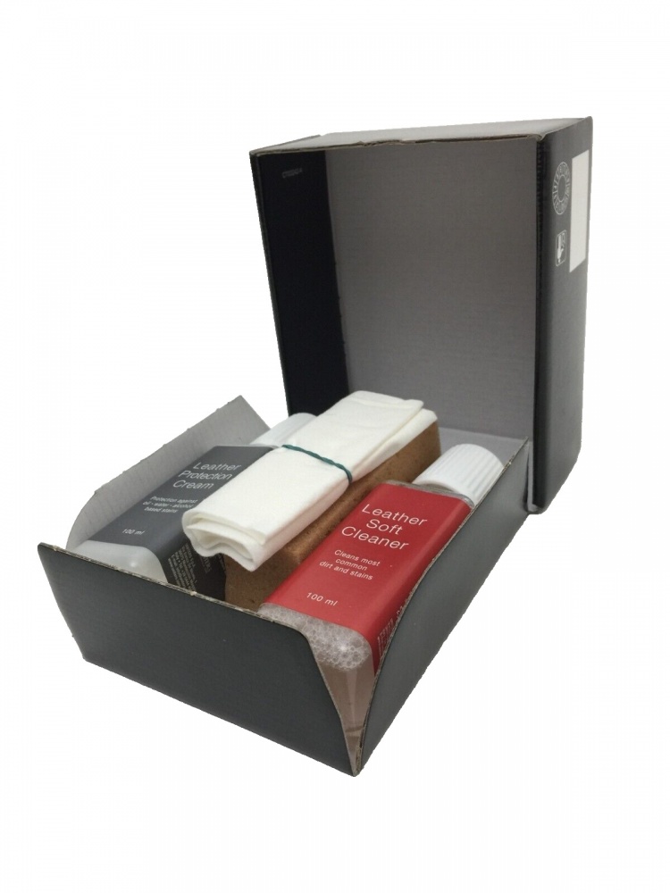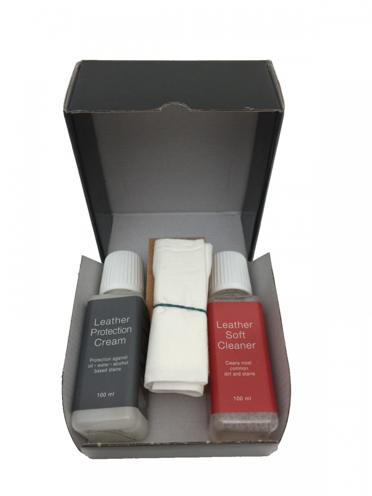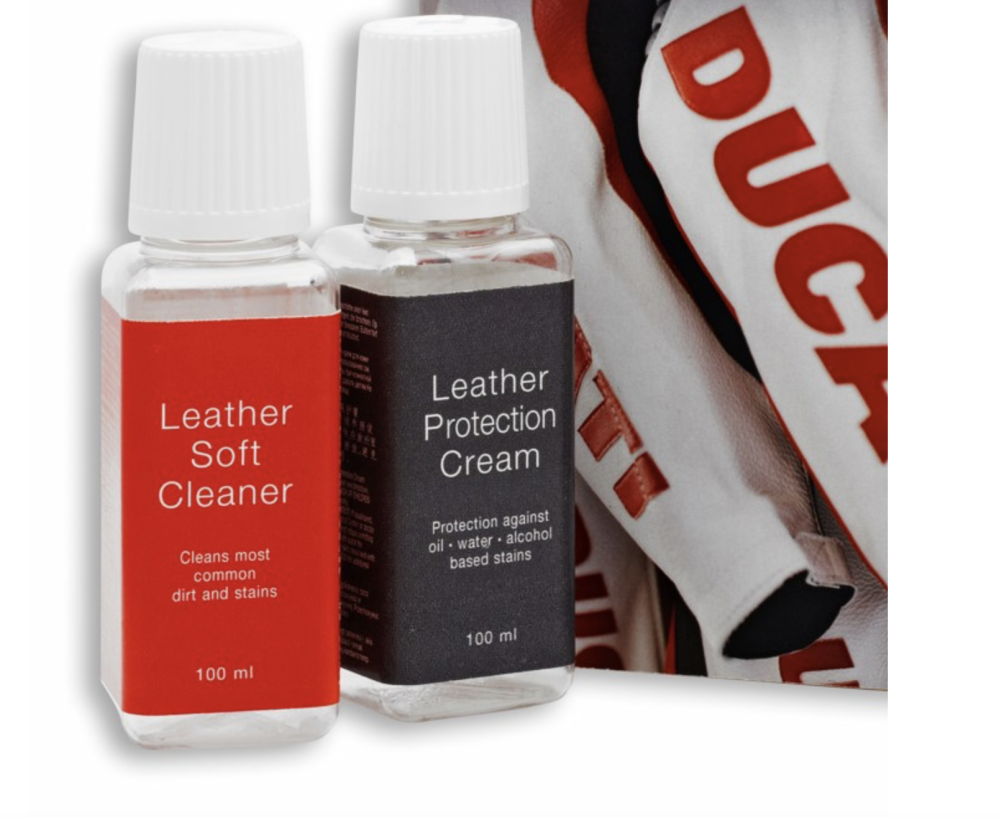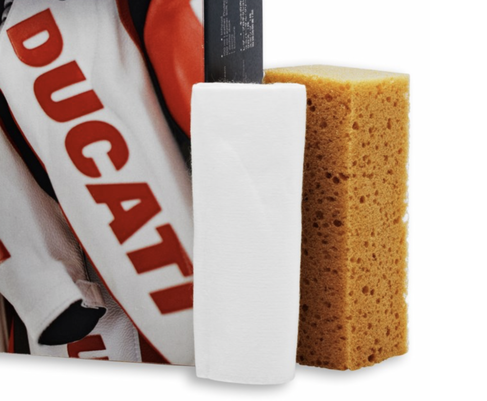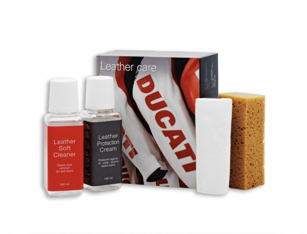 This kit contains 1x 100ml Leather Protection Cream, 1x 100ml Leather Soft Cleaner, 1x soft cloth, 1x sponge & a brochure. The 2 products are for taking care of your Ducati leather & leather-like articles (suits, jackets, trousers, boots, gloves & even leather seats & bags).