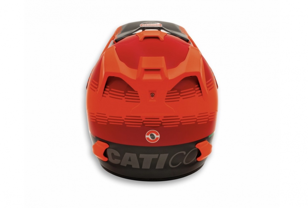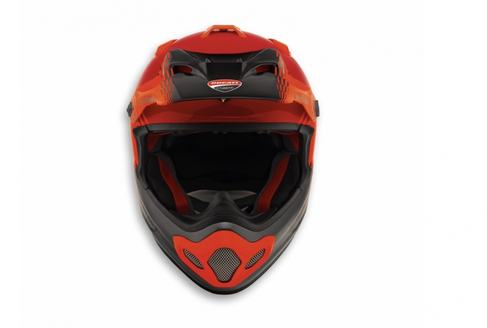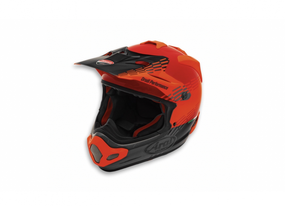 The top-of-the-line Ducati Desmo helmet was developed for off-road use and is dedicated to Enduro and Motocross riders who do not compromise when it comes to safety and comfort. The exterior is made of ScLc (Super complex Laminate construction), a material that offers 40% greater strength than standard fiberglass. The detachable Eco-Pure® fabric inner liner and Facial Contour System (FCS) with elastic support up to the cheekbone make the helmet more comfortable and easy to wear, while providing excellent stability with minimal pressure. The helmet's ventilation is its greatest strength, thanks to the aerodynamically optimized peak, diffusers that create a Venturi effect on the back, and multiple air vents that improve flows inside. The Arai sun visor is elongated and rounded to protect against mud and other objects, while featuring frontal holes for cooling and multiple outlet vents for reduced lift effect at high speeds. Excellent protection from debris is maximized by the air vent on the mouth, mounted from the outside for better penetration resistance, and the one-piece stainless steel mesh goggles, which provide an additional splash barrier and reduce the accumulation of mud. The level of excellence achieved in the areas of safety and comfort can also be seen in terms of aesthetics. This is thanks to the Drudi Performance signature design that echoes the racing liveries of the Reds of Borgo Panigale that have featured in various championships. The eye-catching glossy paint finish is embellished with the fluorescent red curve theme on a Ducati red base, resulting in the style common to all the garments in the new capsule collection dedicated to the world of motocross.