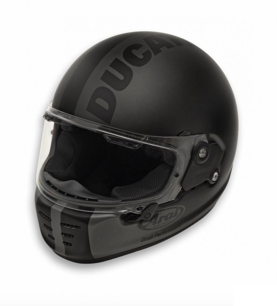 This full-face Ducati Tonal helmet is made by Arai for urban road use. It features a minimal, yet unmistakably, Ducati design made by Drudi Performance. The Peripherally belted E-Complex Laminate Construction (PB E-CLC) shell is designed to distribute the impact of energy over the largest possible surface area, while the new materials generate a decrease in weight, delivering an excellent compromise between rigidity, resistance and lightness. The visor offers the rider a wider field of vision thanks to the VAS (Variable Axis System) technology, in order to tackle every bend at the right angle. The interior, made from removable and washable hypoallergenic fabric, uses the Facial Contour System (FCS) technology which makes the helmet easier to put on thanks to the elastic foam support up to the cheekbone that compresses and expands under minimum pressure, thus ensuring excellent stability and more comfort. The helmet is further enhanced by the three-axis open-close system, which seals the visor perfectly in place and activates the de-mist function or the complete opening with a simple gesture, even while riding the bike. The FFS (Free Flow System) system creates an airflow inside the helmet that reduces wind noise and turbulence, while increasing the dispersion of hot air. The Emergency Release System (ERS) also facilitates the removal of the helmet by physicians and first responders, minimizing the risk of further injuries. The speaker housings and Peel Away ear muffs with a 5 mm removable layer, enhance the level of riding comfort even further. The perfect travel companion to enjoy one's journey in complete safety, without forsaking the pleasure and excitement of riding one's bike, with a discreet, but by no means understated style.