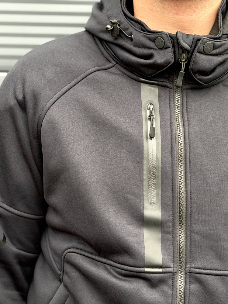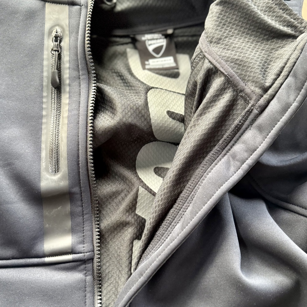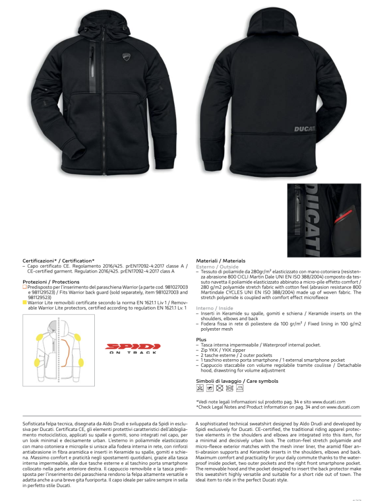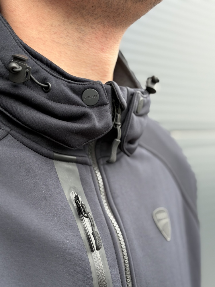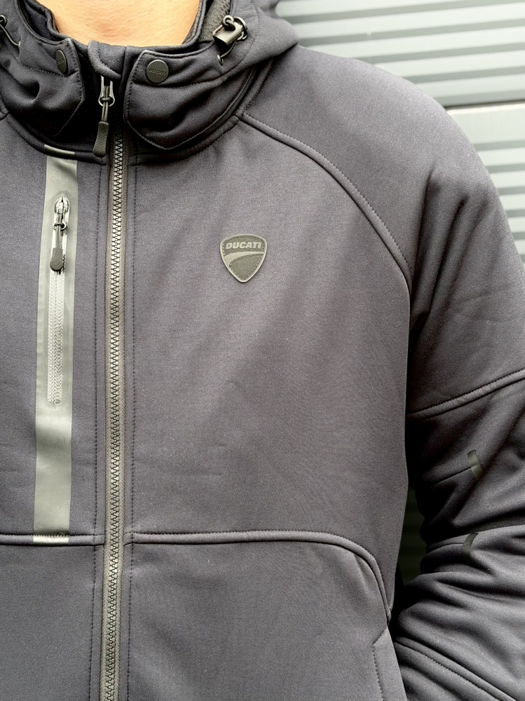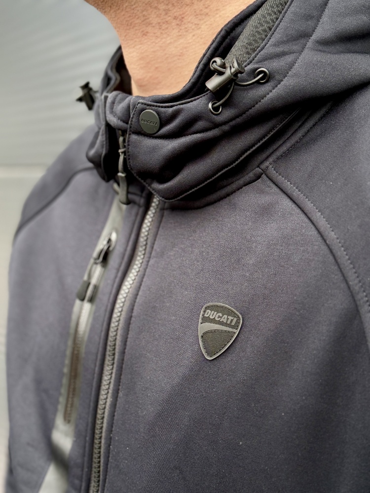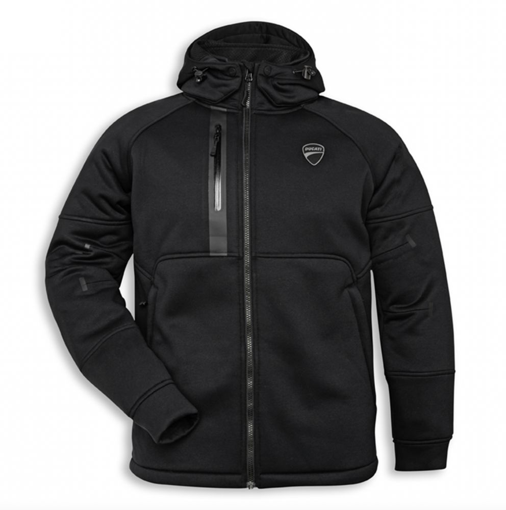 A sophisticated technical sweatshirt designed by Aldo Drudi and developed by Spidi exclusively for Ducati. CE-certified, the traditional riding apparel protective elements in the shoulders and elbows are integrated into this item, for a minimal and decisively urban look. The cotton-feel stretch polyamide and micro-fleece exterior matches with the mesh inner liner, the aramid fiber anti-abrasion supports and Keramide inserts in the shoulders, elbows and back. Maximum comfort and practicality for your daily commute thanks to the waterproof inside pocket, two outer pockets and the right front smartphone pocket. The removable hood and the pocket designed to insert the back protector make this sweatshirt highly versatile and suitable for a short ride out of town. The ideal item to ride in the perfect Ducati style.