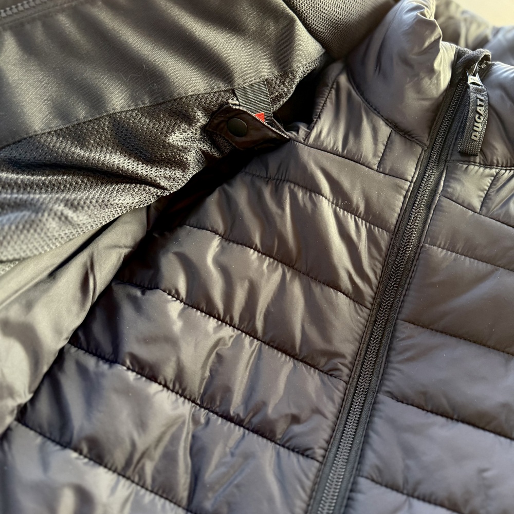Enjoy ultimate practicality with the connector zip, allowing seamless attachment to matching trousers from the same line. The removable thermal inner lining doubles as a casual down jacket, perfect for wearing off the bike.