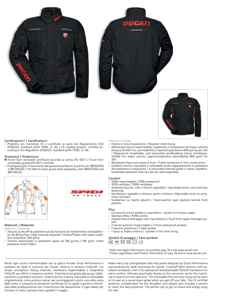 Safety is paramount with CE-certified protector compartments for the shoulders and elbows, plus a dedicated section for inserting a back protector. This jacket is the perfect ally to hop on your Ducati and simply enjoy the ride in style and protection.